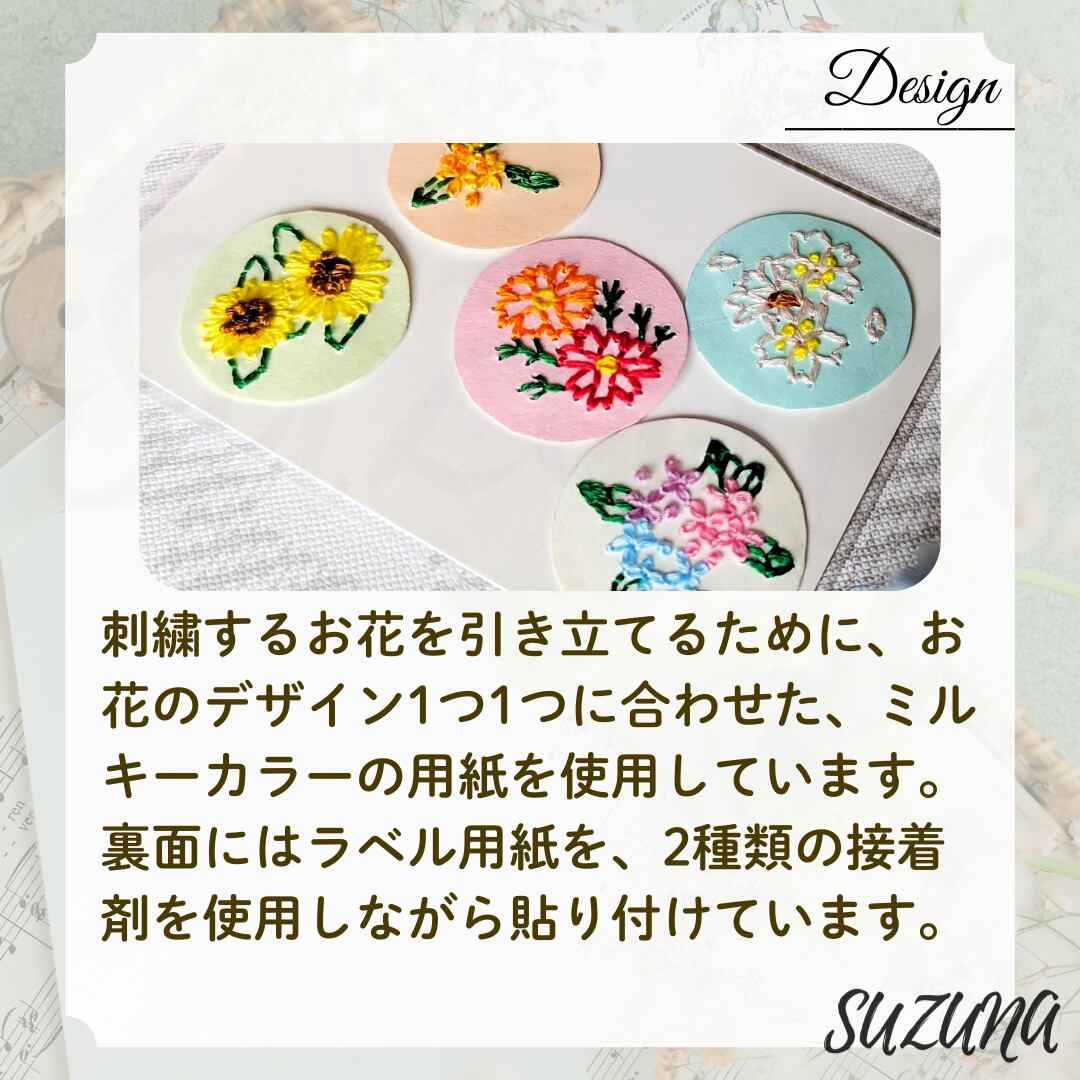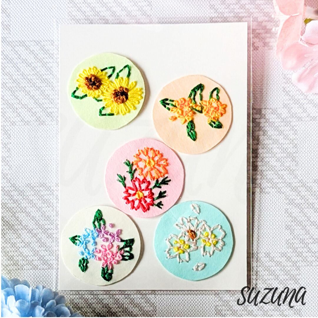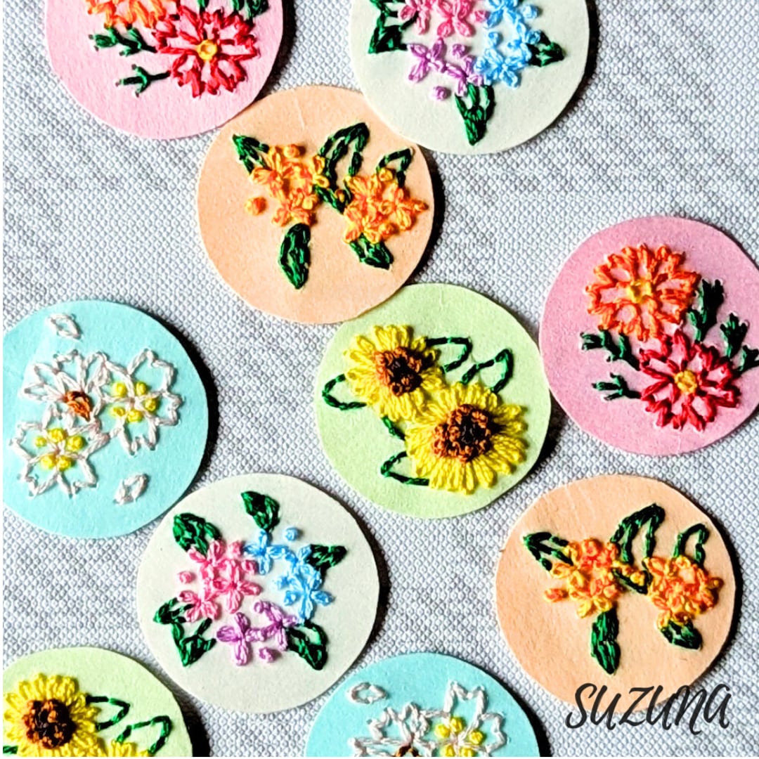 円形のシールにサクラ、アジサイ、ヒマワリ、キンモクセイ、コスモスをそれぞれ刺繍したものをお作りします。