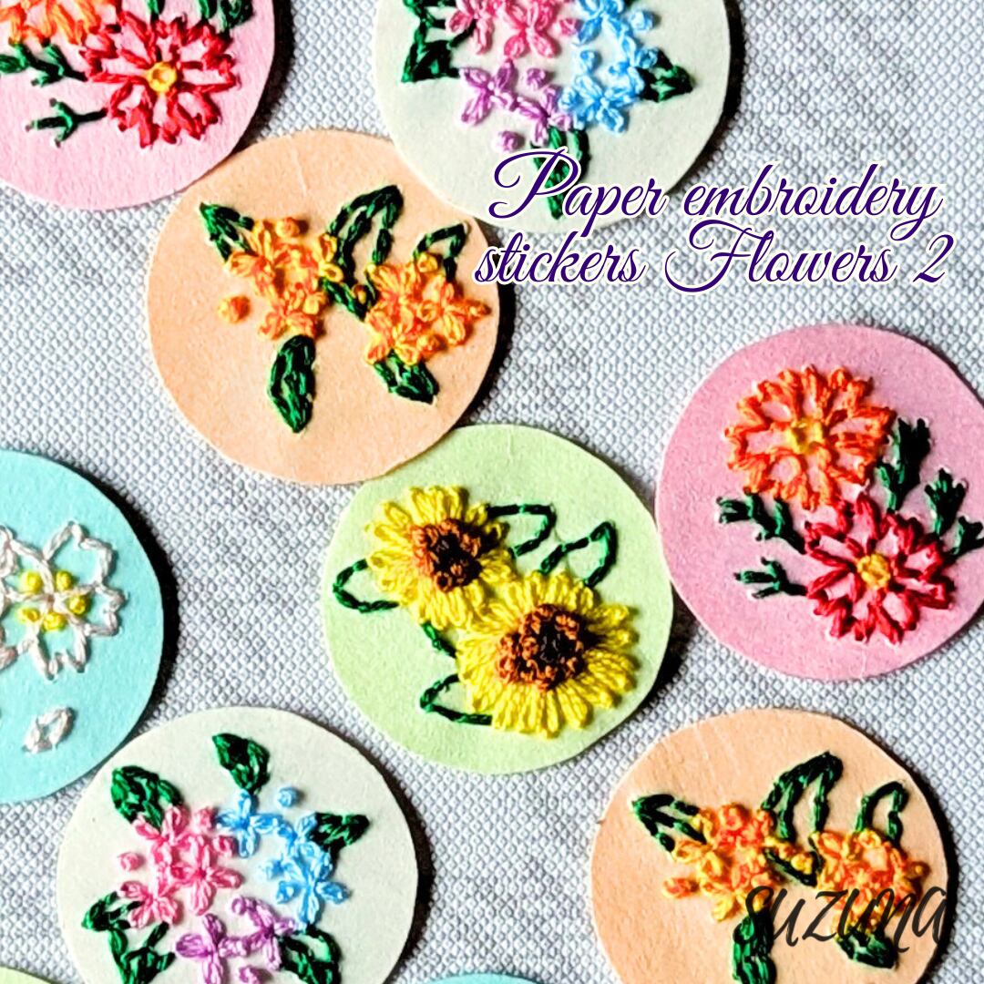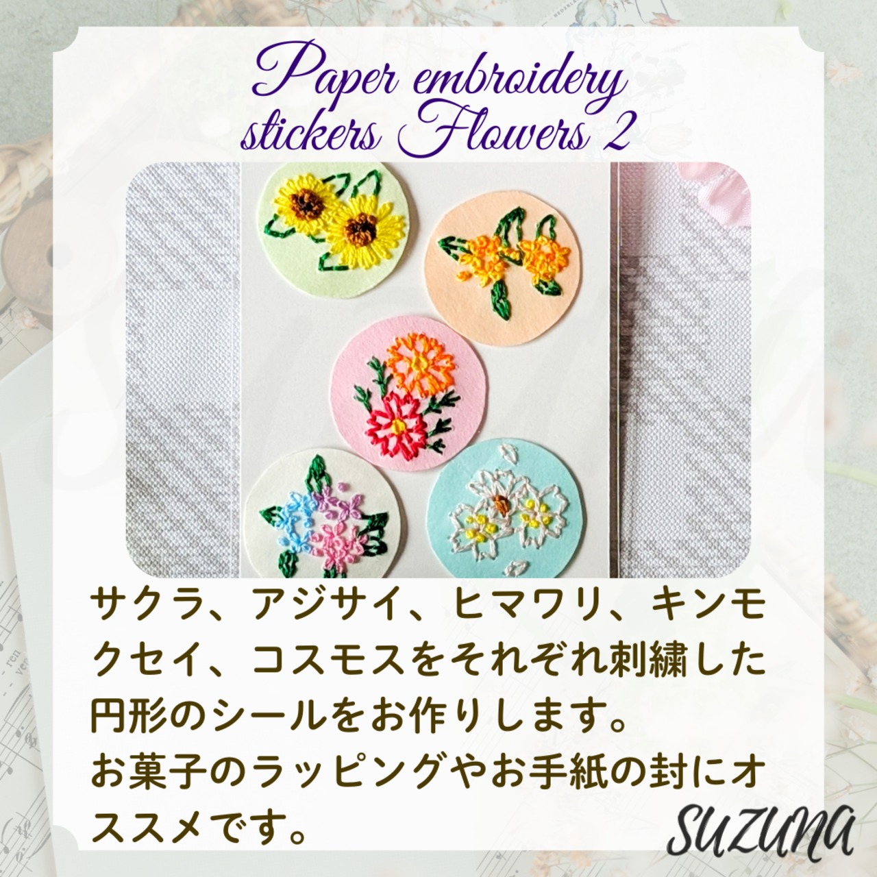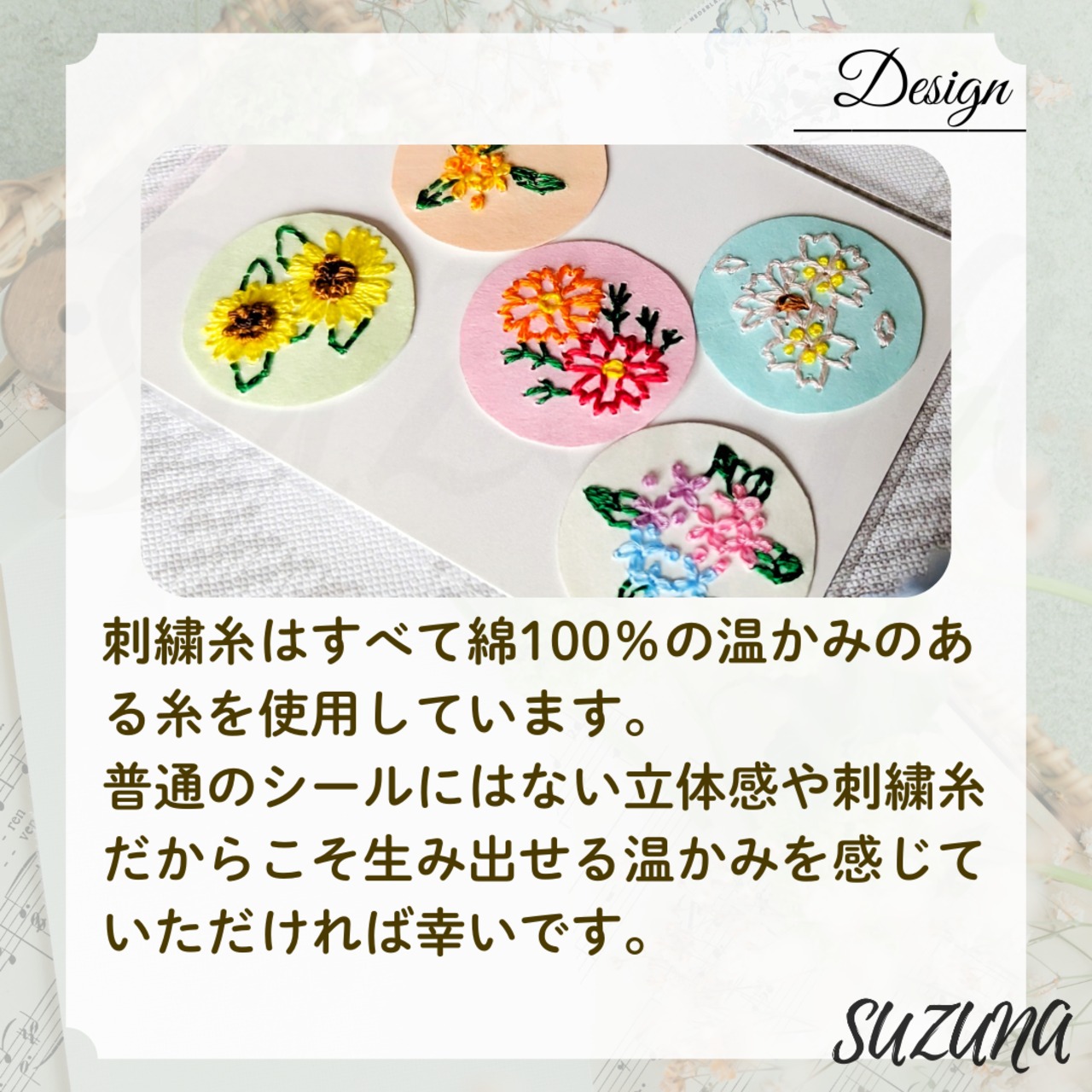 円形のシールにサクラ、アジサイ、ヒマワリ、キンモクセイ、コスモスをそれぞれ刺繍したものをお作りします。