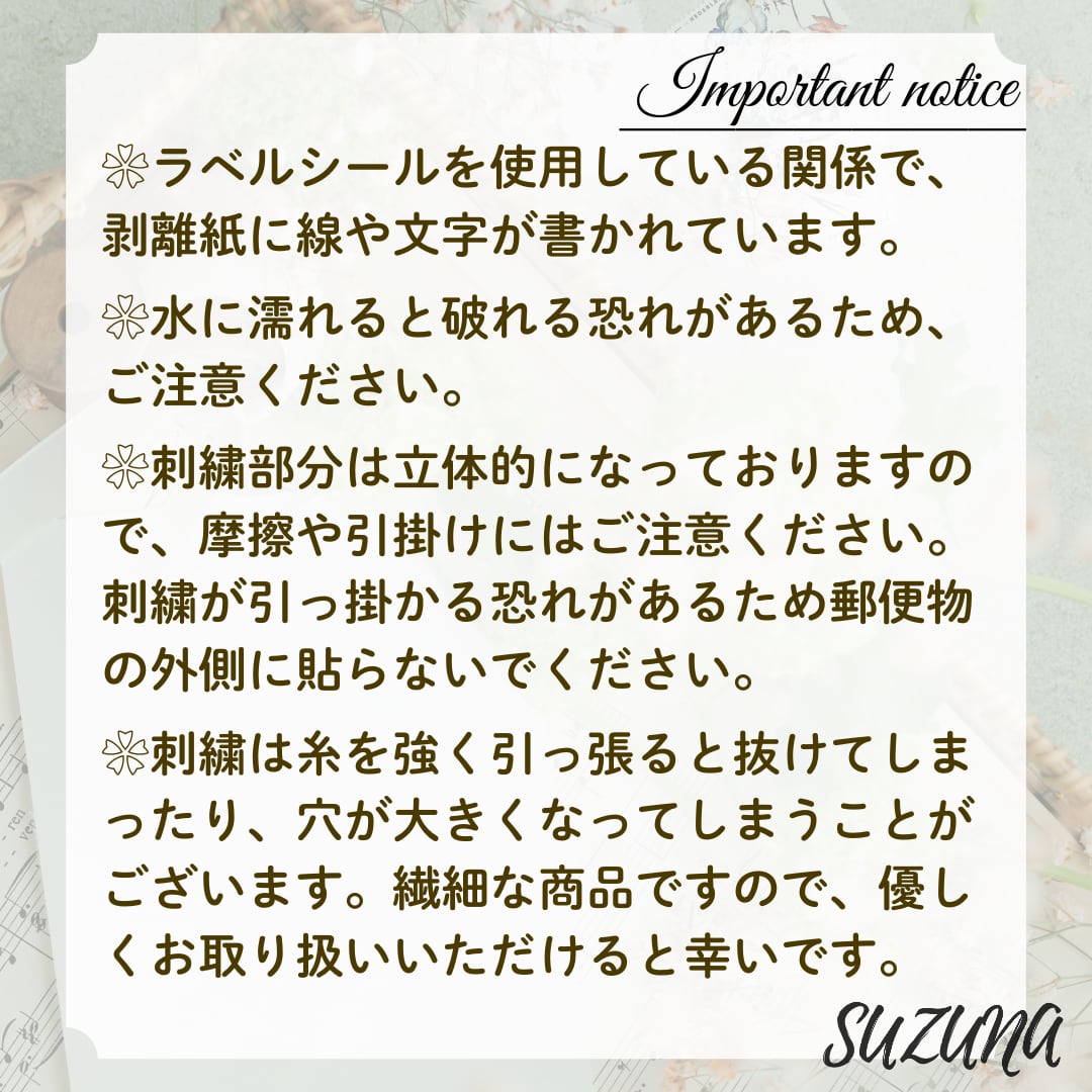 ・刺繍部分は立体的になっておりますので、摩擦や引掛けにはご注意ください。刺繍が引っ掛かる恐れがあるため郵便物の外側に貼らないでください。