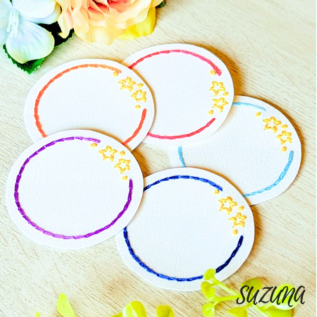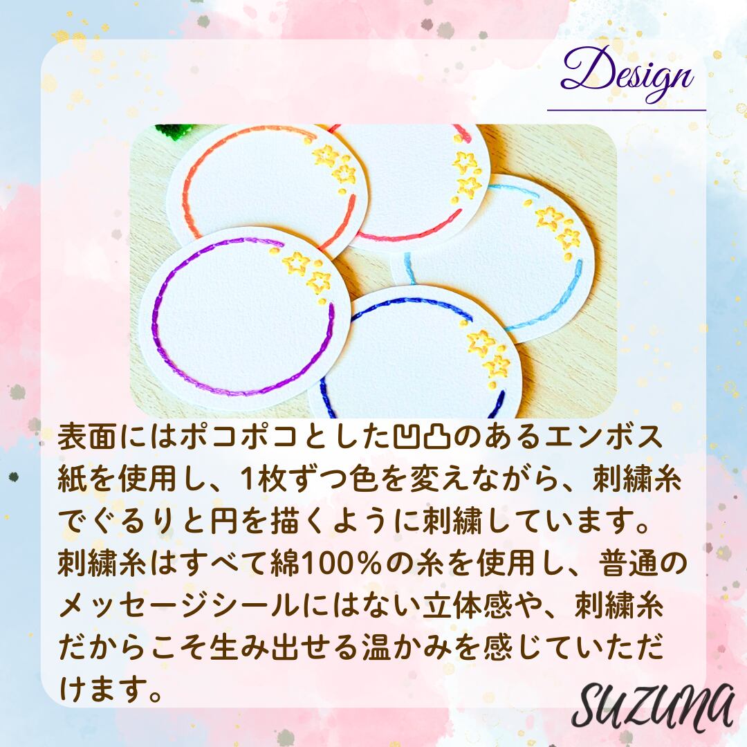 刺繍糸はすべて綿100%の糸を使用し、普通のサンキューシールにはない立体感や、刺繍糸だからこそ生み出せる温かみを感じていただければ幸いです。