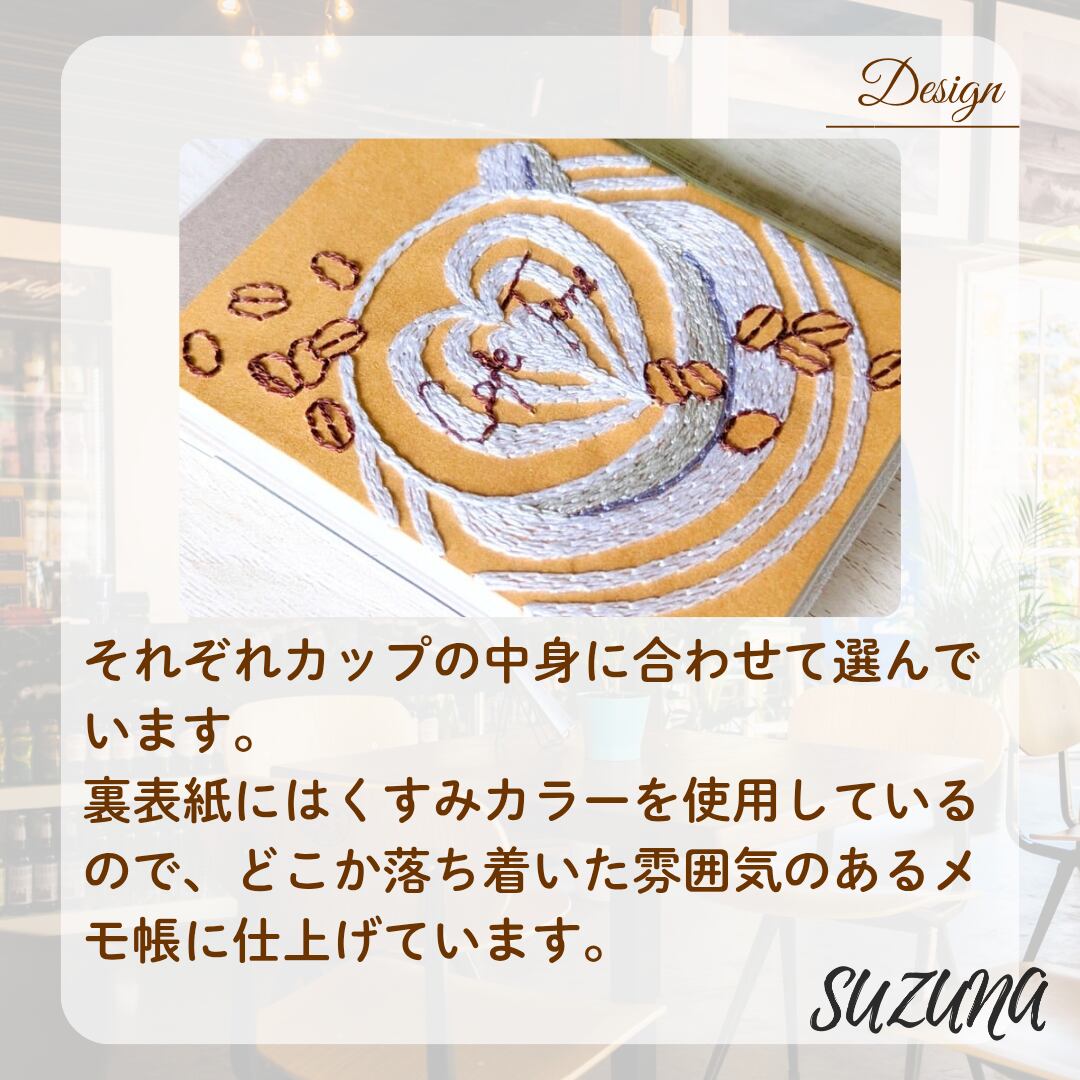 表表紙は、それぞれカップの中身に合わせて選んでいます。裏表紙にはくすみカラーを使用しているので、どこか落ち着いた雰囲気のあるメモ帳に仕上げています。