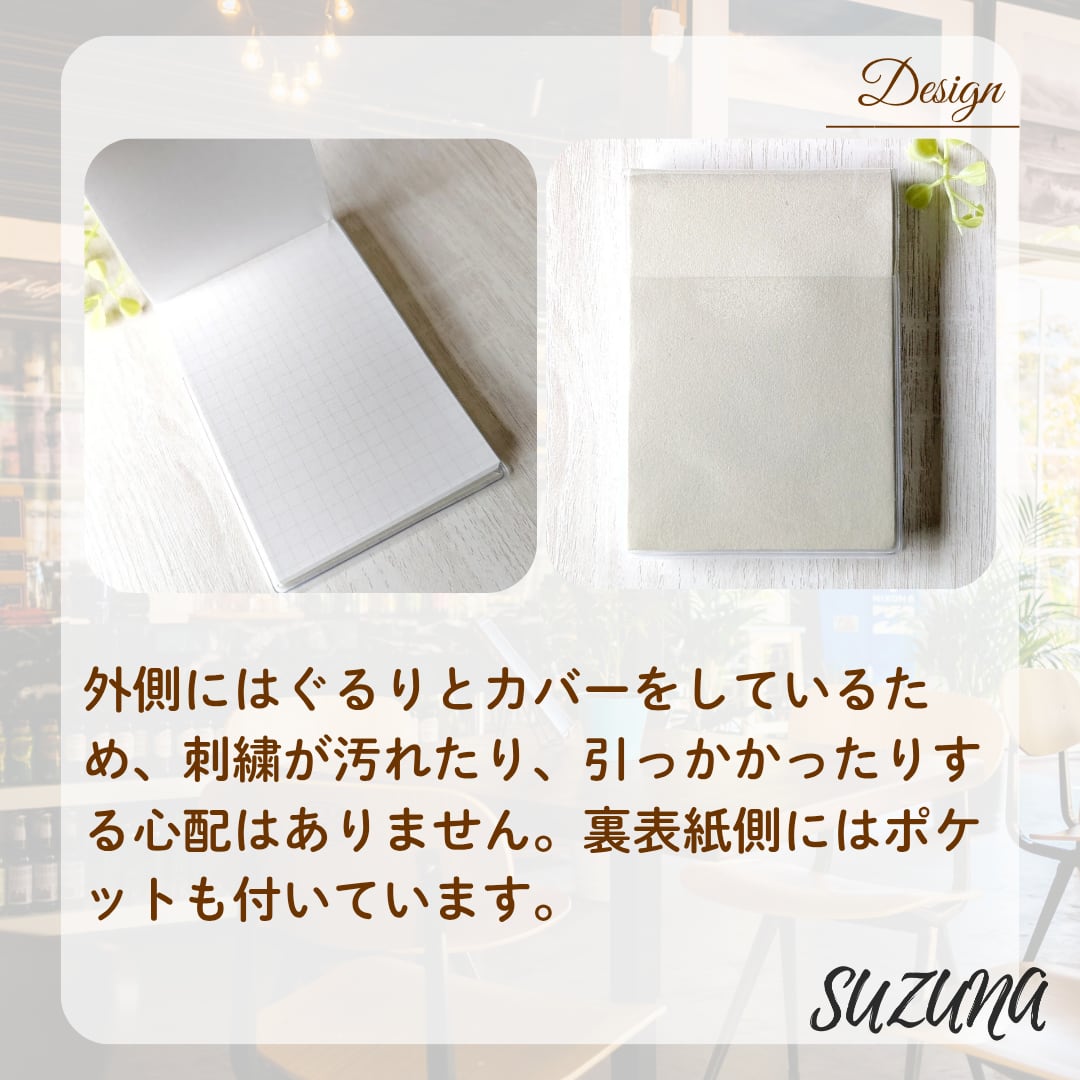外側にはぐるりとカバーをしているため、刺繍が汚れたり、引っかかったりする心配はありません。背表紙側にはポケットも付いています。