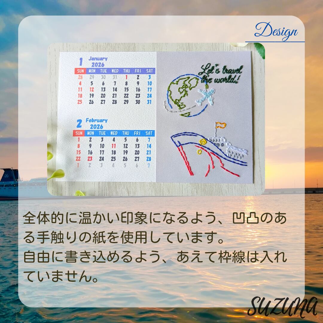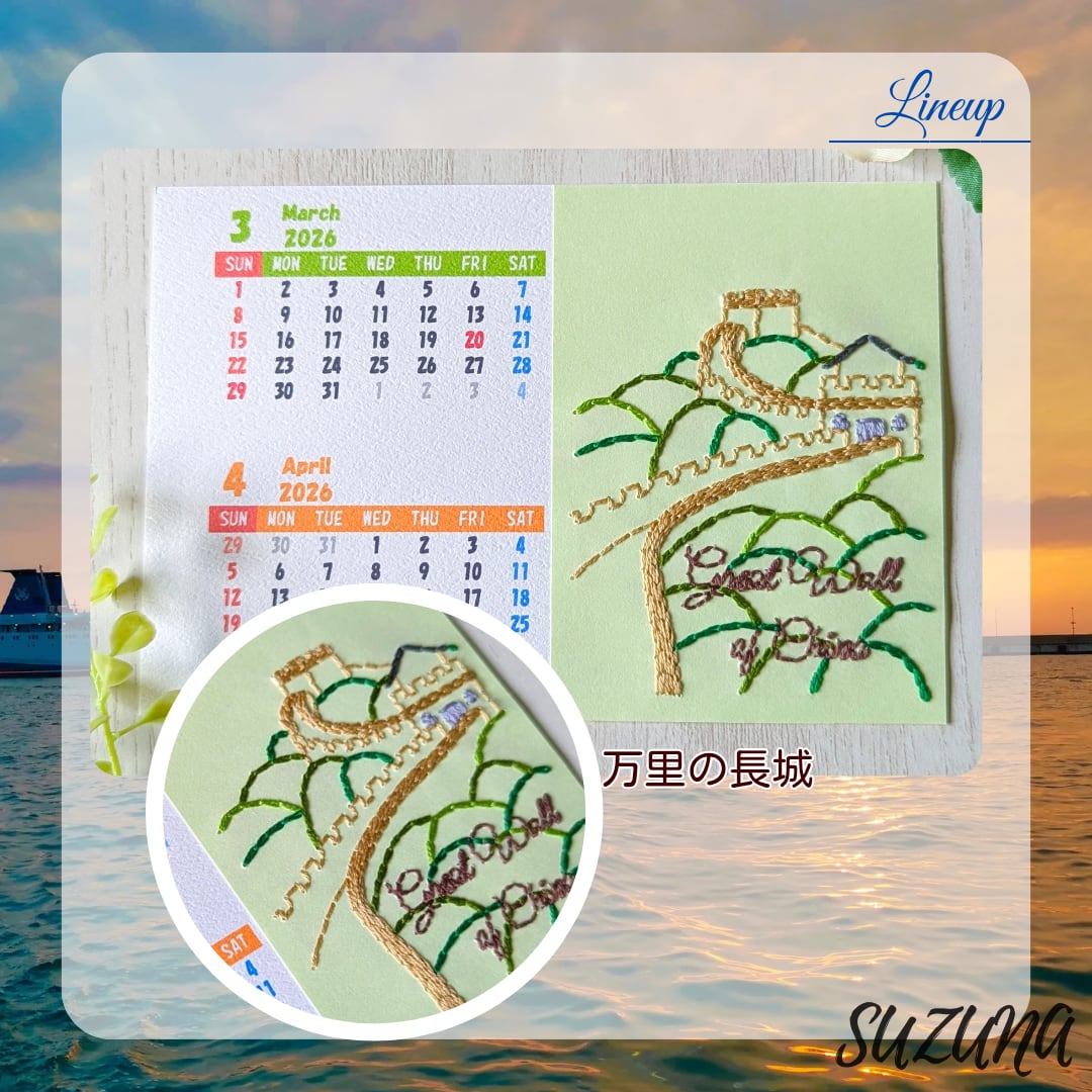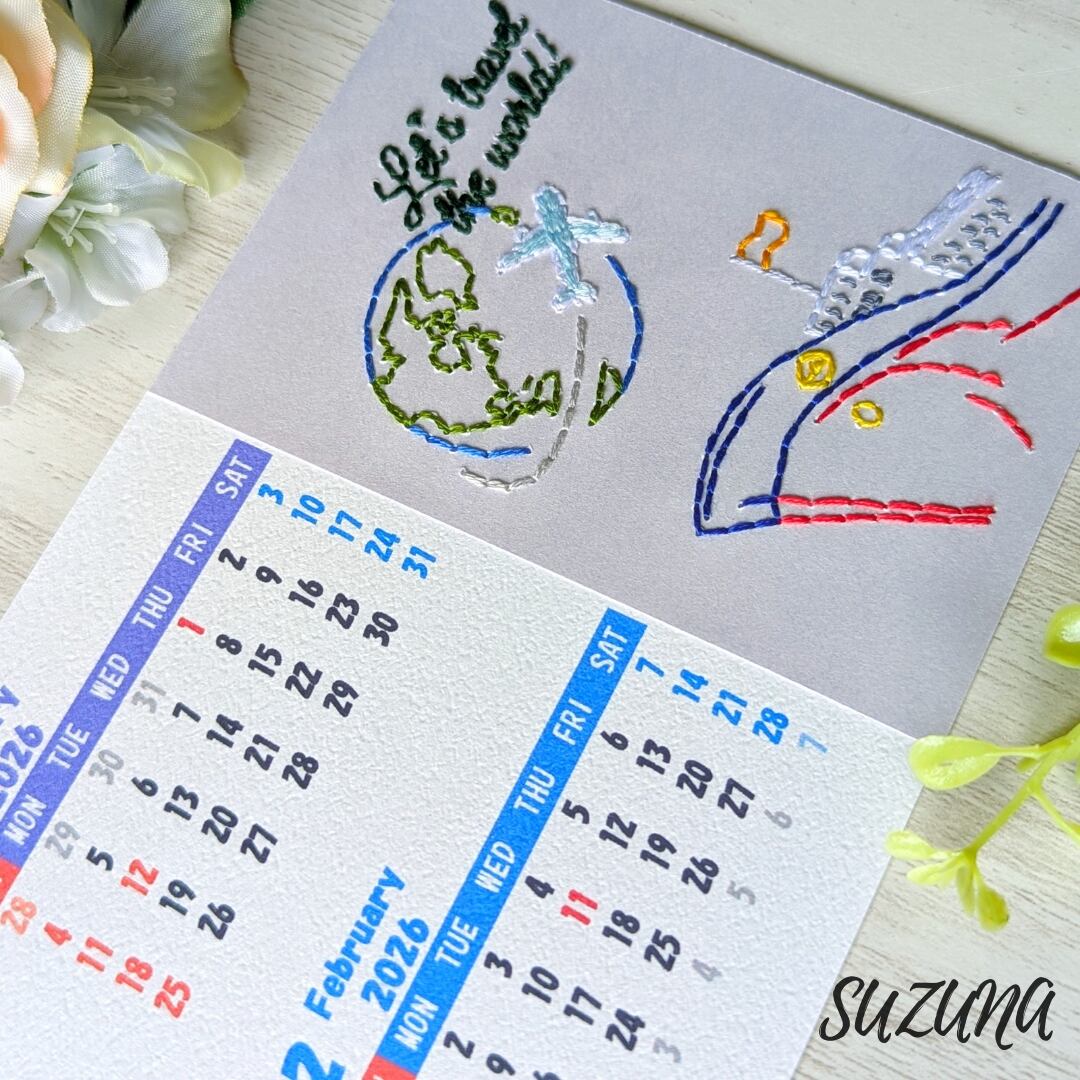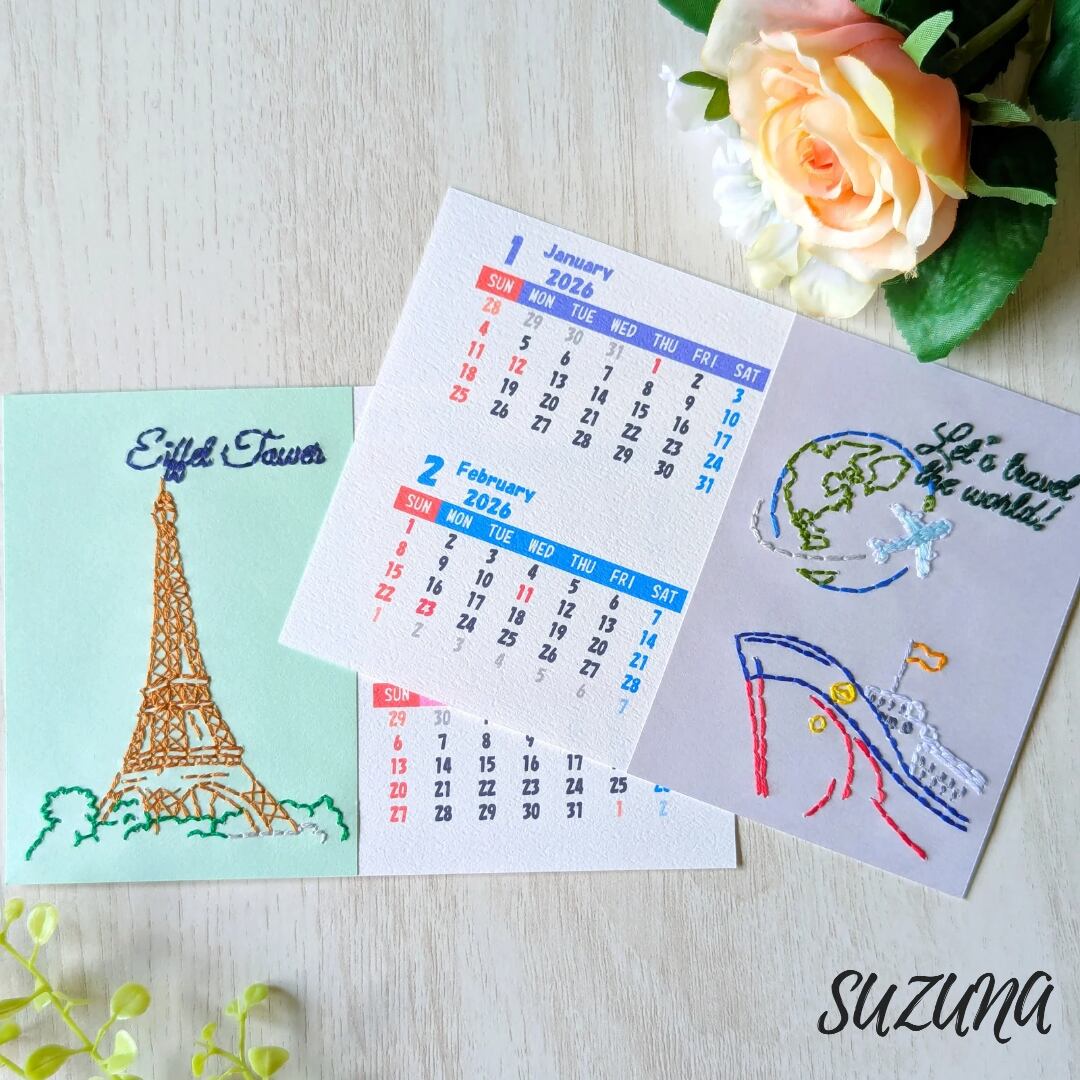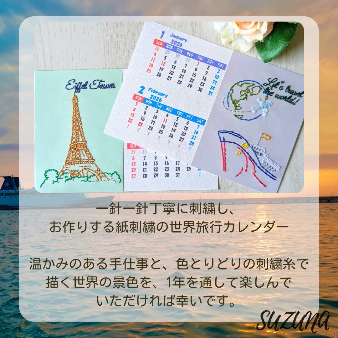 ハンドメイド 手作り 紙刺繍 刺繍 手芸 ペーパークラフト カレンダー 卓上 観光地 カラフル 自然 植物 建物 建造物 Let's travel the world! Great Wall of China Golden Gate Bridge Big Ben Savanna Eiffel Tower 地球 船 飛行機 雲 山 夕焼け 夕日