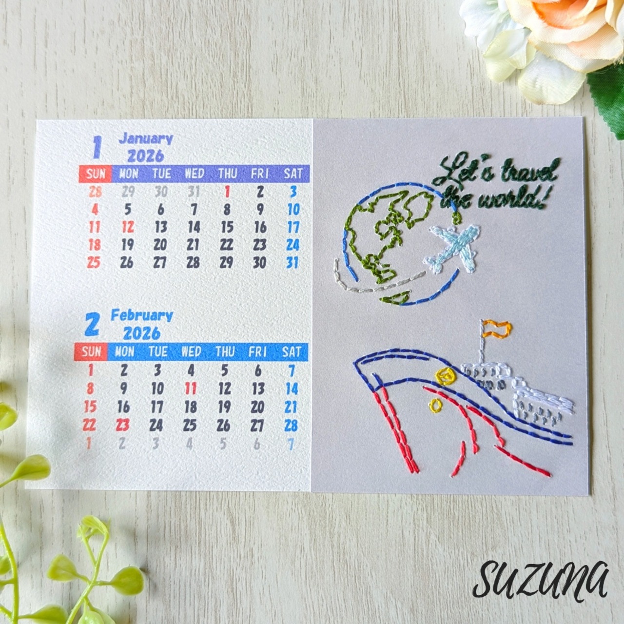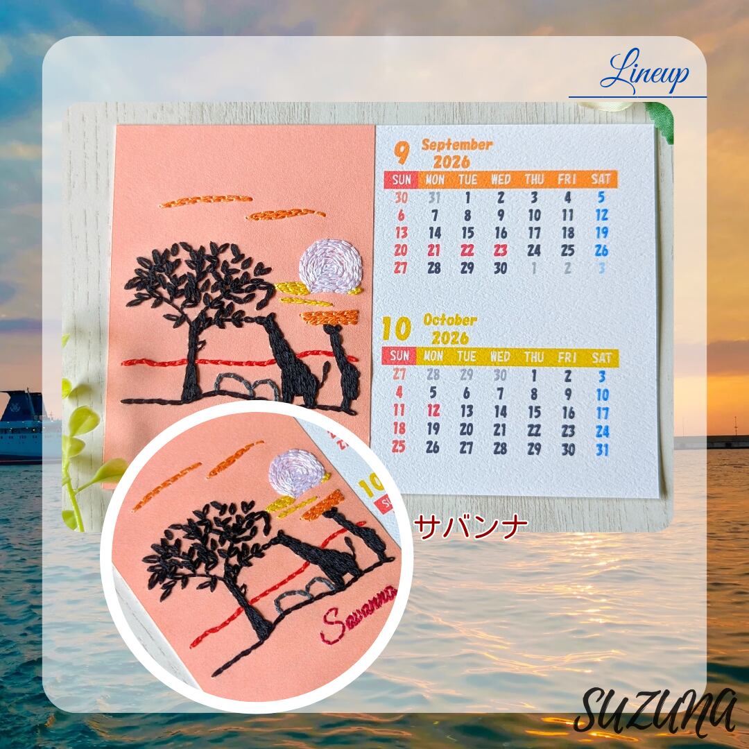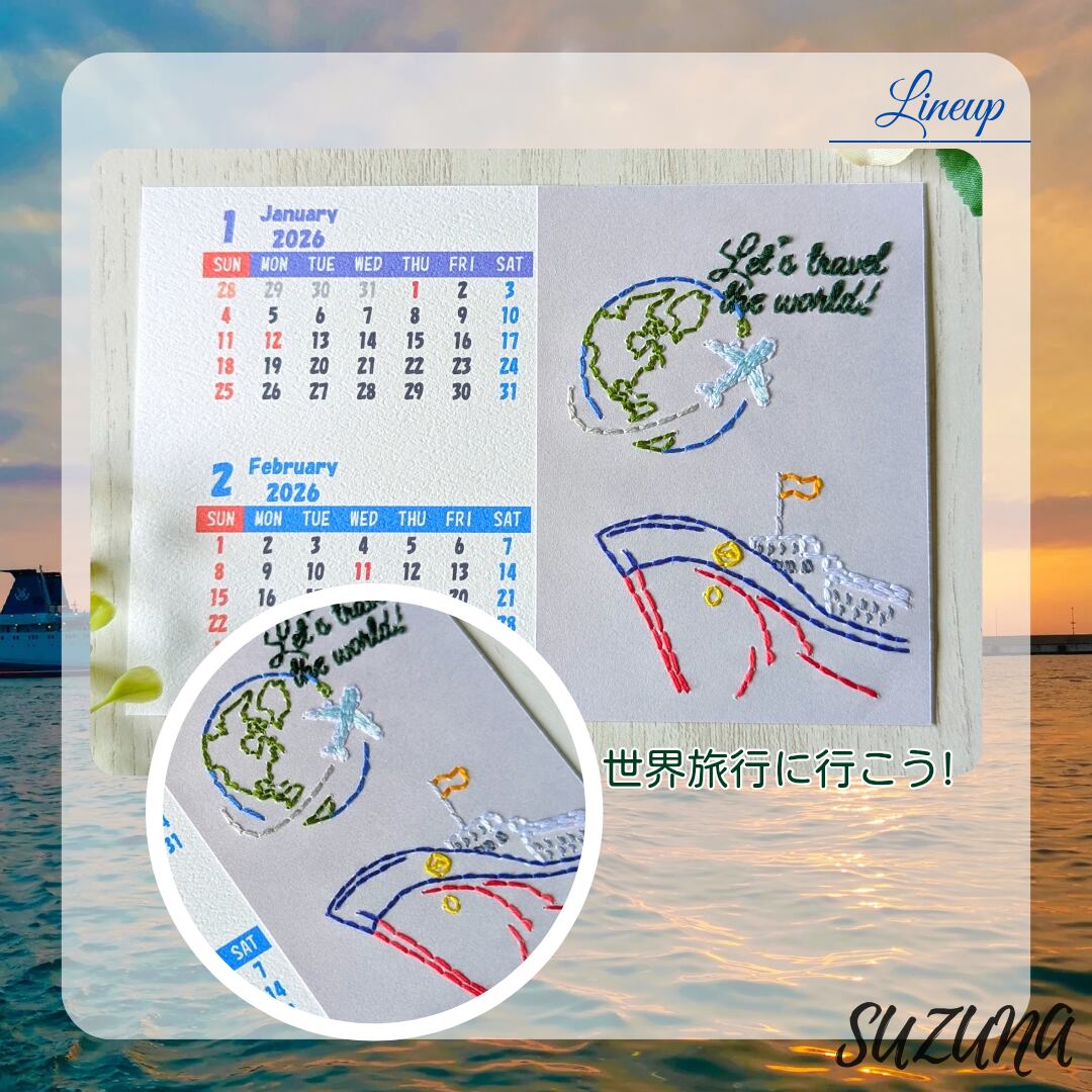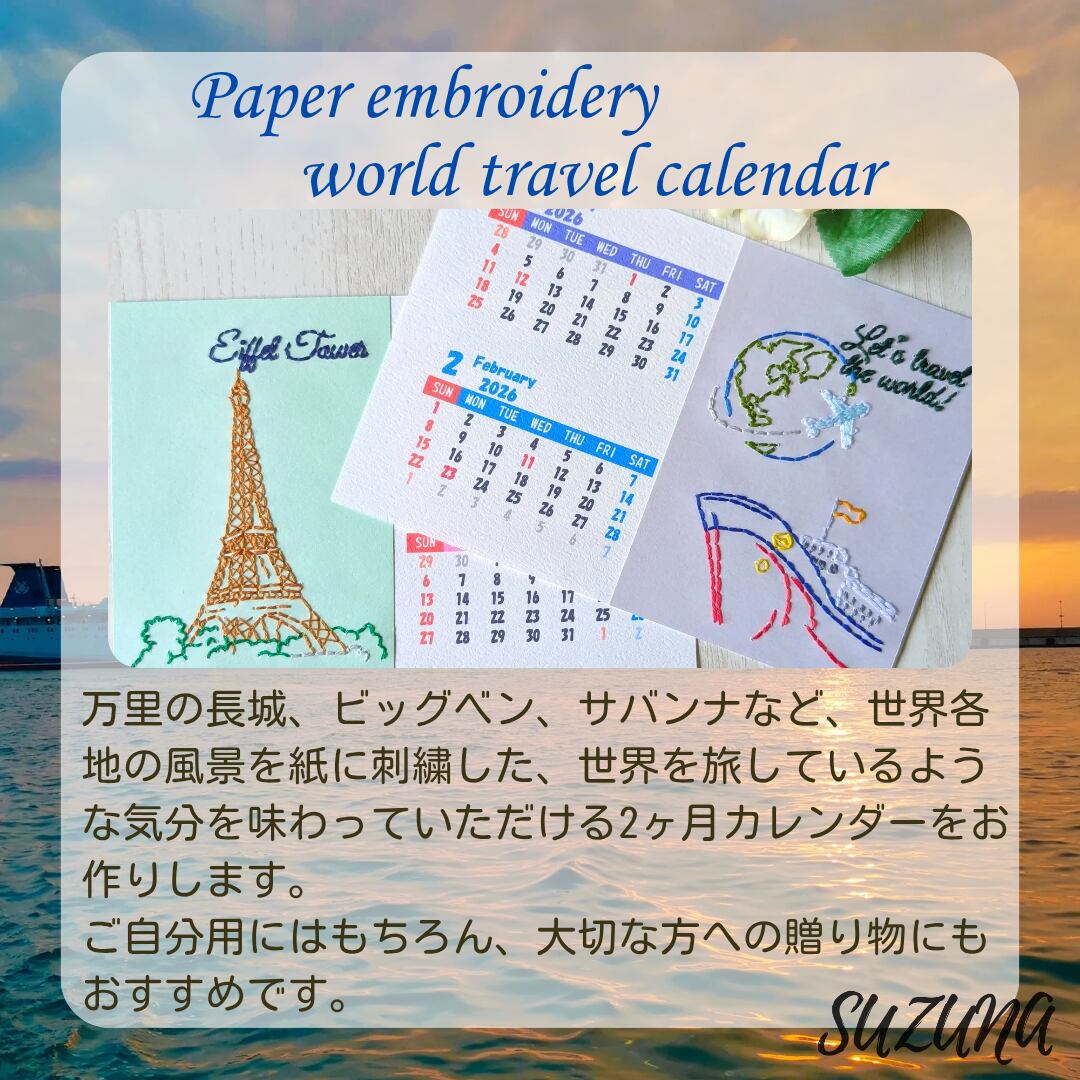 一枚一枚、紙に手刺繍で世界各地の風景を描いた、2ヶ月ごとのカレンダーをお作りしています。