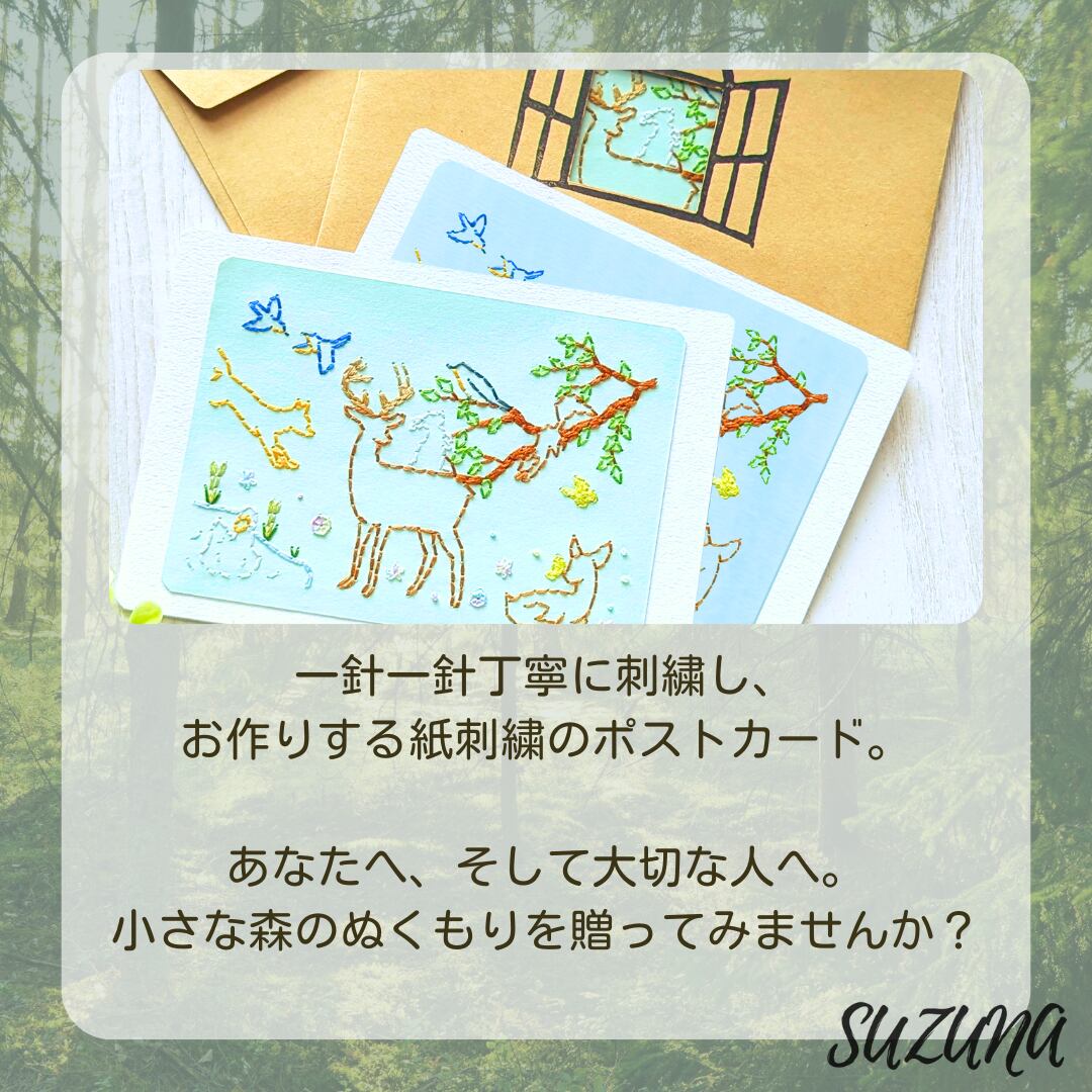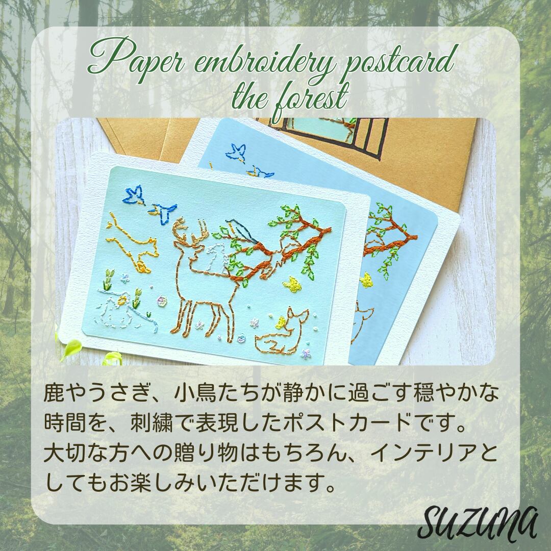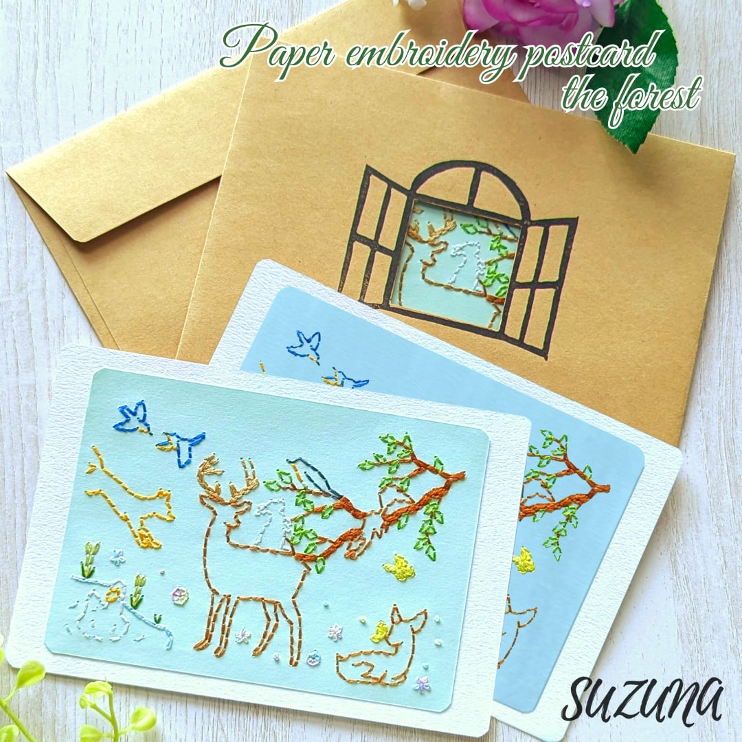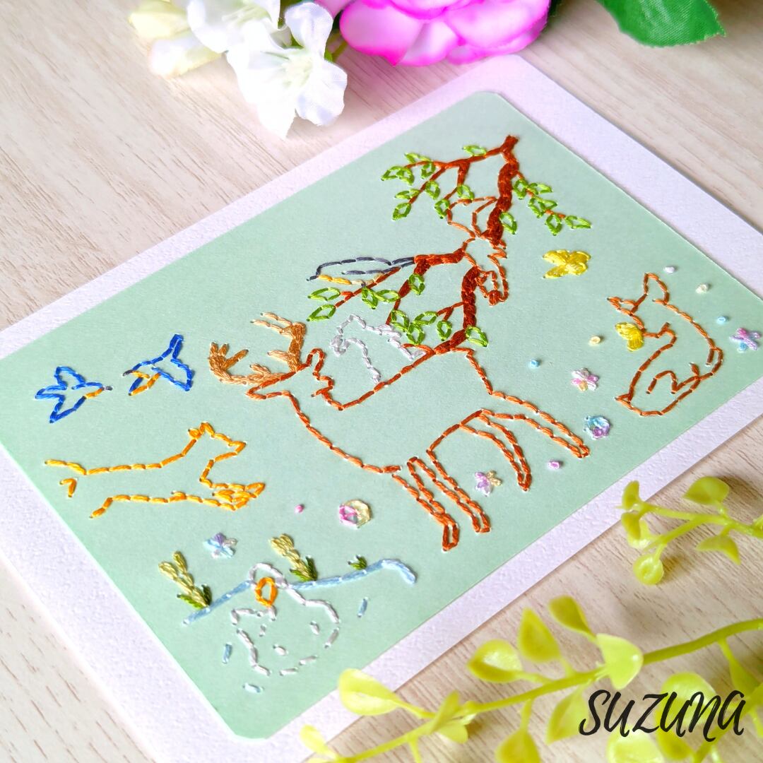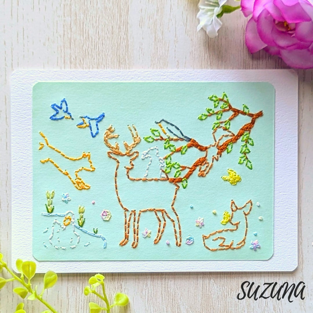 紙刺繍 刺繍ポストカード 刺繍カード 手刺繍 ハンドメイド刺繍 飾れるポストカード インテリアポストカード 森 森の動物 動物刺繍 鹿 うさぎ 小鳥 ナチュラル 北欧 ボタニカル 植物 小花 ギフト プレゼント 贈り物 インテリア ポストカード 手作り ハンドメイド