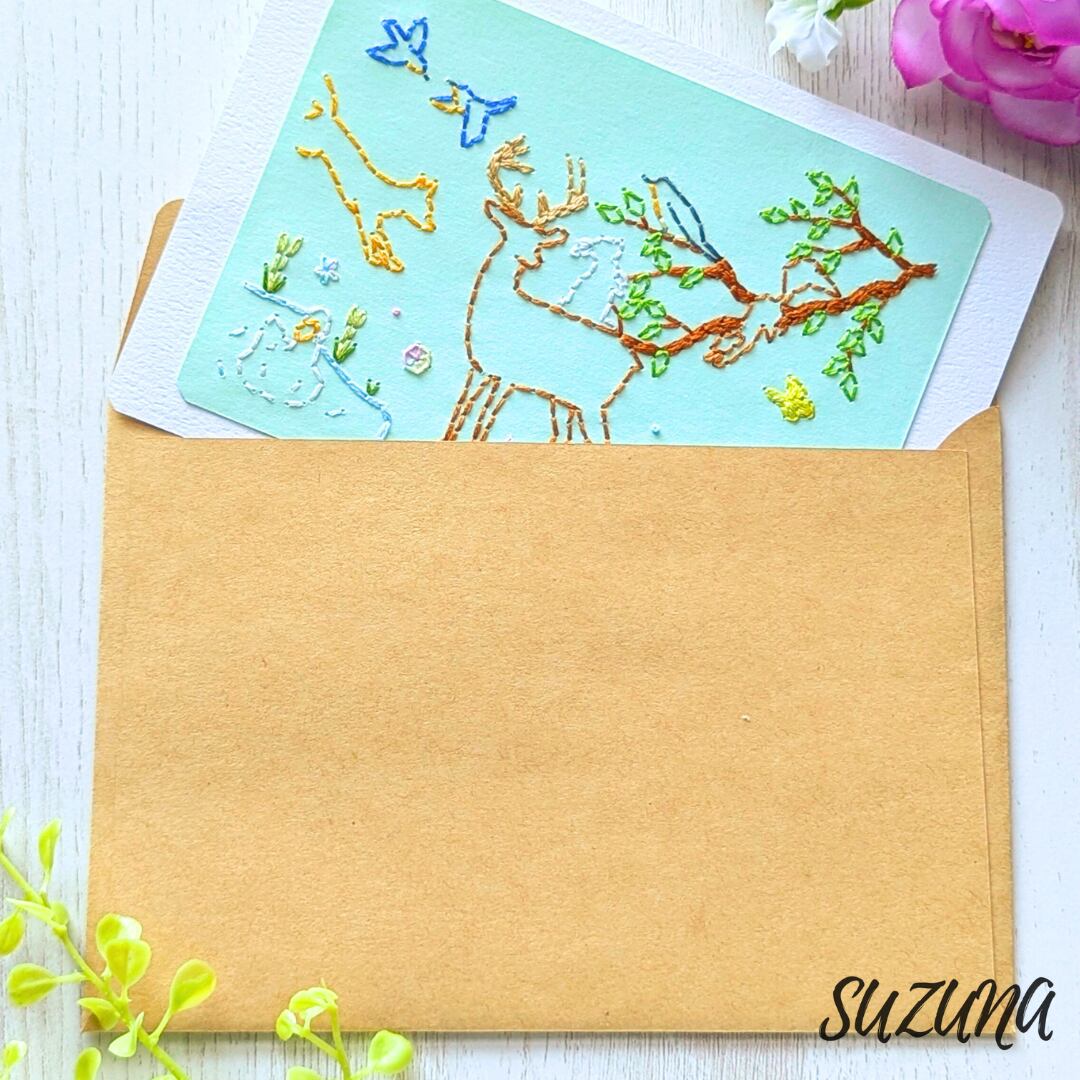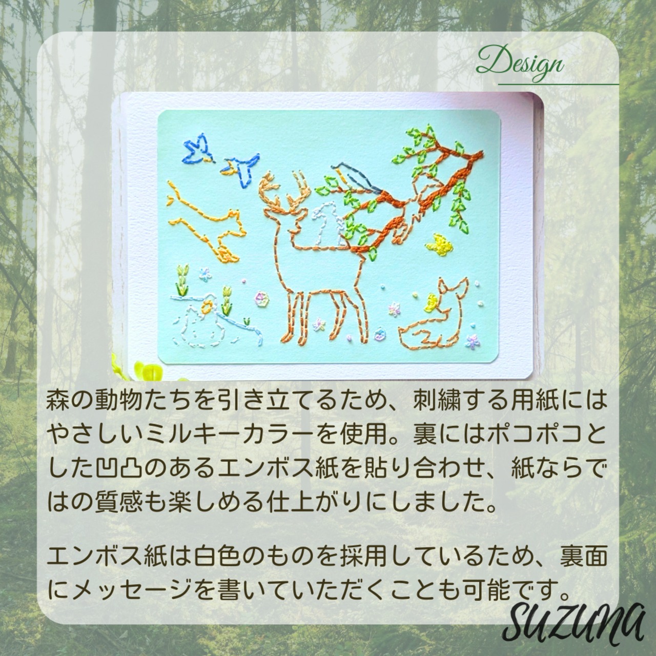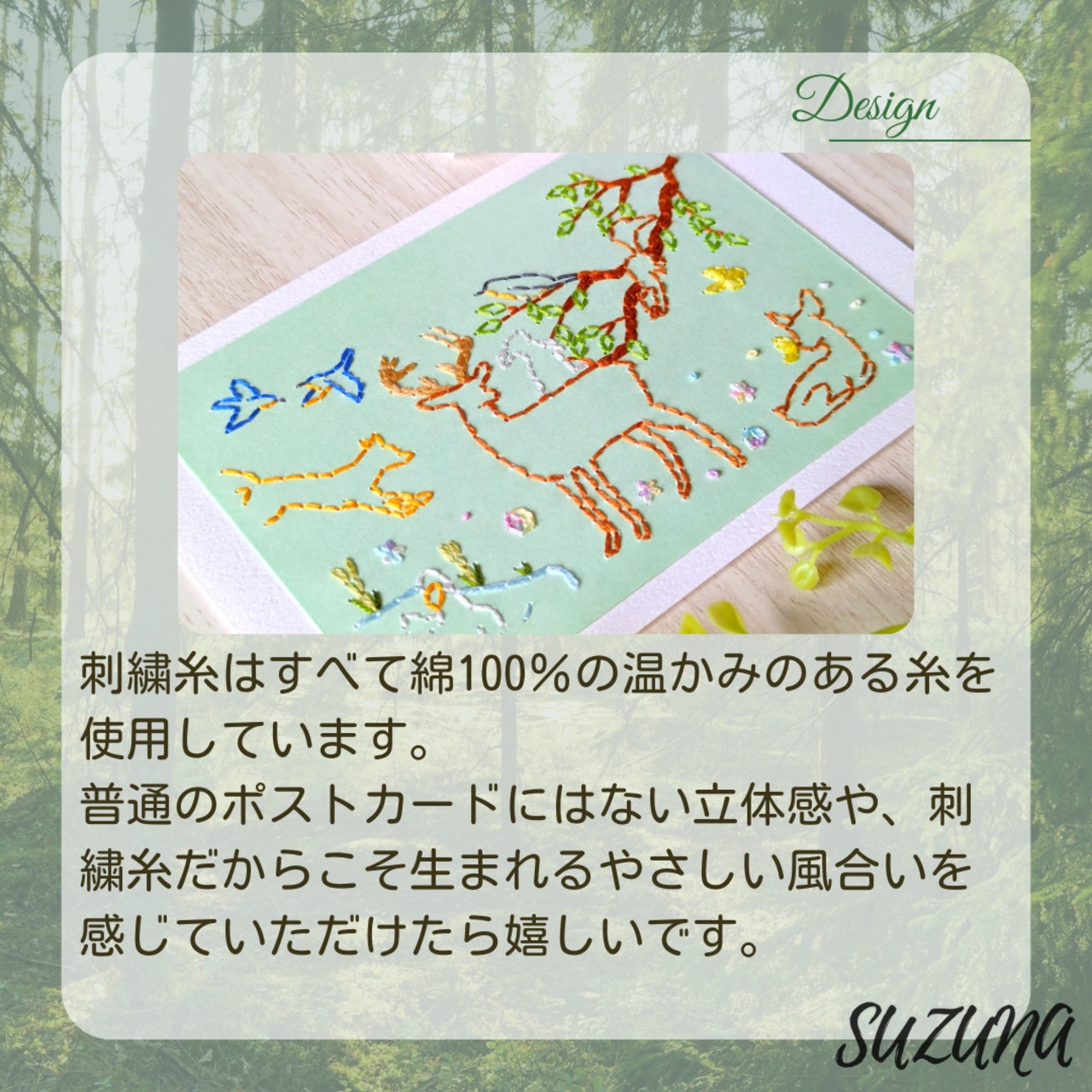 森でのびのびと暮らす動物たちを、一針一針丁寧に刺繍したポストカードと、専用の封筒をお作りします。